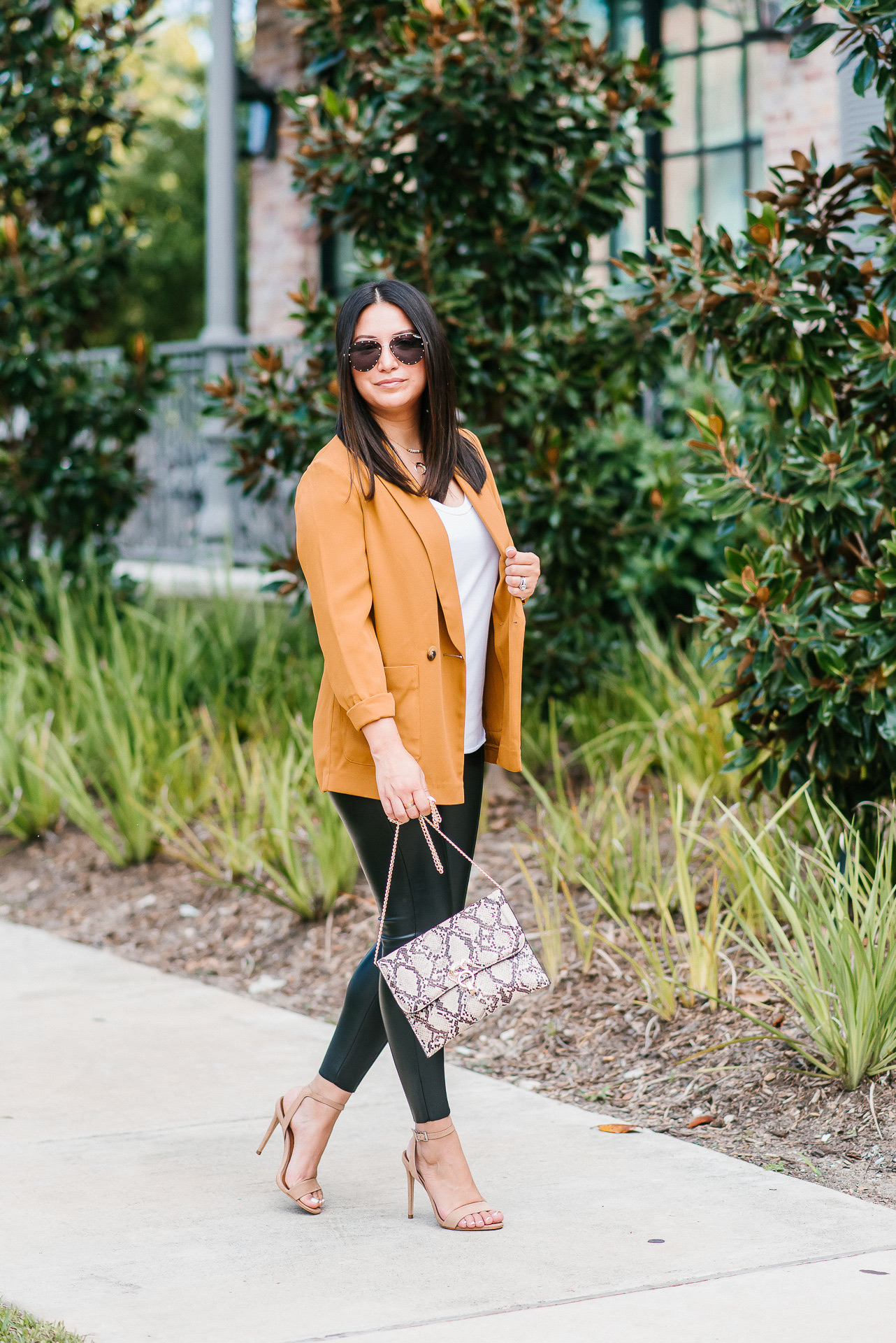 Speaking of blazer, this is another favorite look of mine from last fall. This is the perfect date night, girls night out look but it’s still sophisticated and chic. I love the touch of snake print in the handbag to add a trendy touch to this look. This tank is a go to of mine and still in stock, so it’s a must for year round but perfect for layering in the fall.