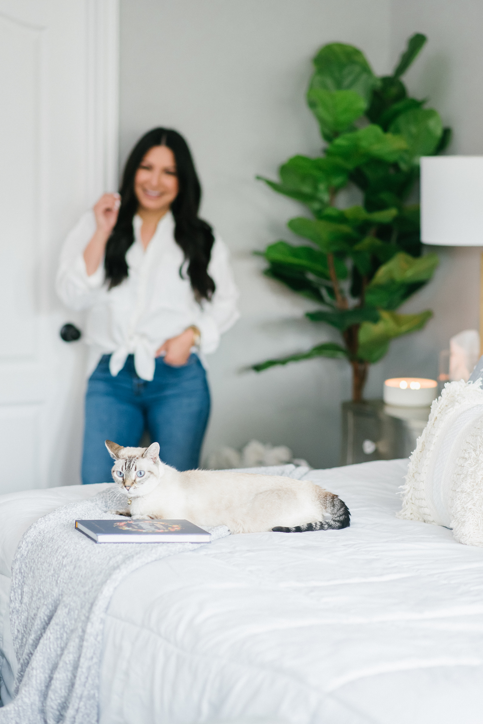I love a clean bright space, it just feels so clean and fresh to me, so I wanted to keep that vibe in here. I really wanted this space to be calming and light, so I kept with a soft palette of white and greys. I’ve been loving Walmart’s throw pillows lately. They have so many options with tons of texture. I stacked several together to create a casual but still elegant look on the all white bedding. I added this super soft throw blanket also from Walmart to the edge of the bed. The second I put it down Lexy went straight too it. It’s fur-baby approved!!