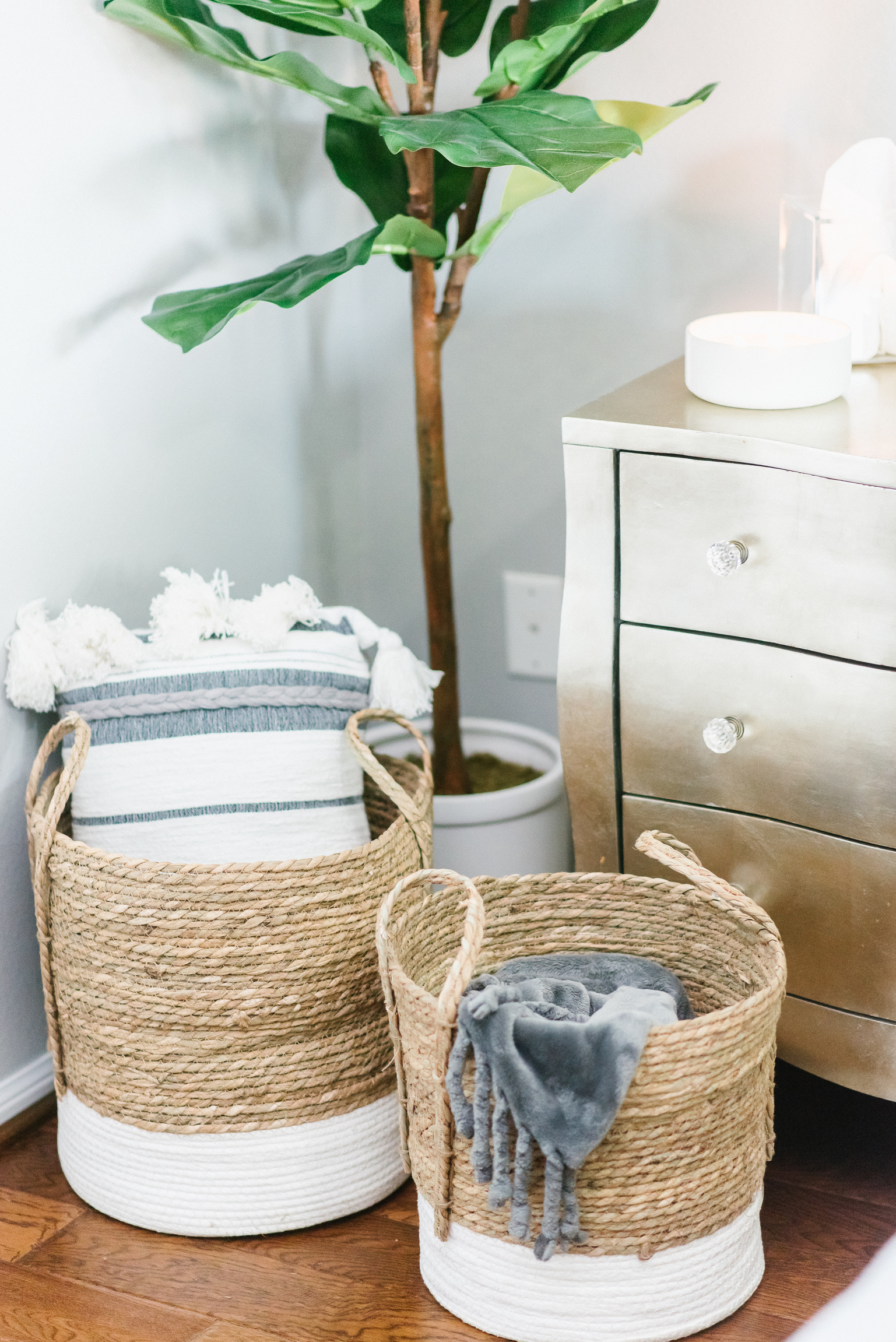 I am all about functionality so I had to add these baskets to my side of the bed. It’s the perfect spot to put throw pillows when not in use or for extra blankets. I like it very cold at night, so I always reach for an extra blanket or two too cuddle up in. Oh and I have to mention these new lamps. They are such a great find and look way more expensive than they are. They are the perfect size for night stands. I still have a ton of room for tissue, a candle and other bedtime essentials.