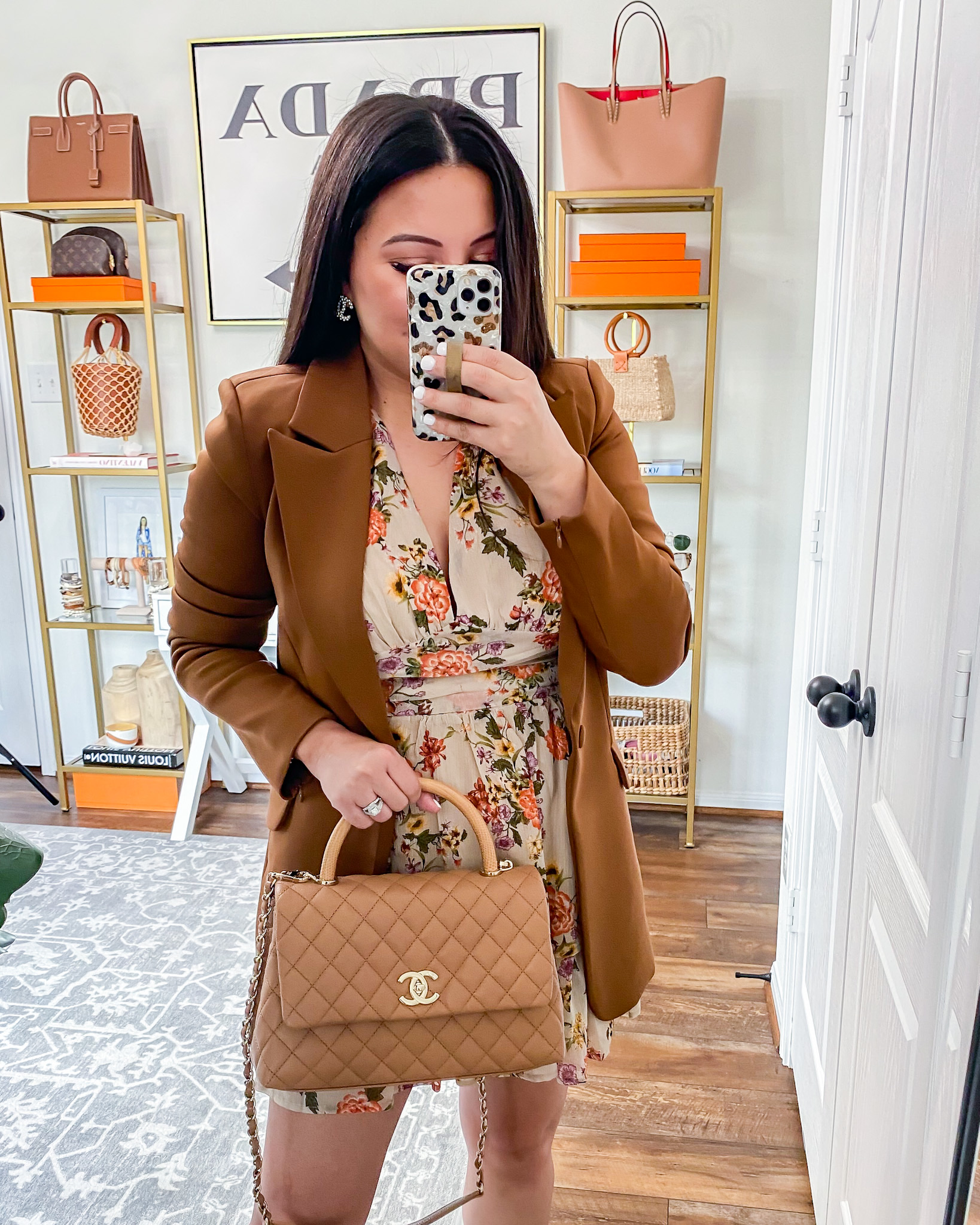The Chanel Coco Handle was my first purchase between these two bags. I’ve had this bag on my wishlist for years. I was waiting for the perfect color and finally found it. It’s definitely on the more structured side since the top strap is on the stiff side. It also has the added option of a non-adjustable chain strap. You can wear this bag two ways, top handle without the strap and with the strap added to wear on the shoulder or crossbody. I love this bag when I want to look a little more polished. Its classic silhouette is perfect in a professional setting. Of course, you can dress it down, but I love this style for a more polished look.