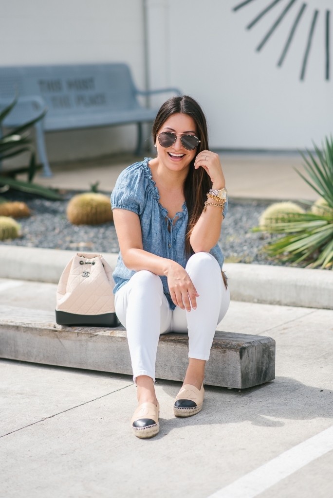 Chanel Gabrielle Backpack review featured by top US fashion blog, LuxMommy: image of a woman wearing a Chanel Gabrielle Backpack, Tory Burch cap toe flat, NYDJ chambray top, Quay Australia studded sunglasses, Michele diamond two tone watch, Stella & Dot bracelet, and a Kendra Scott charm bracelet.