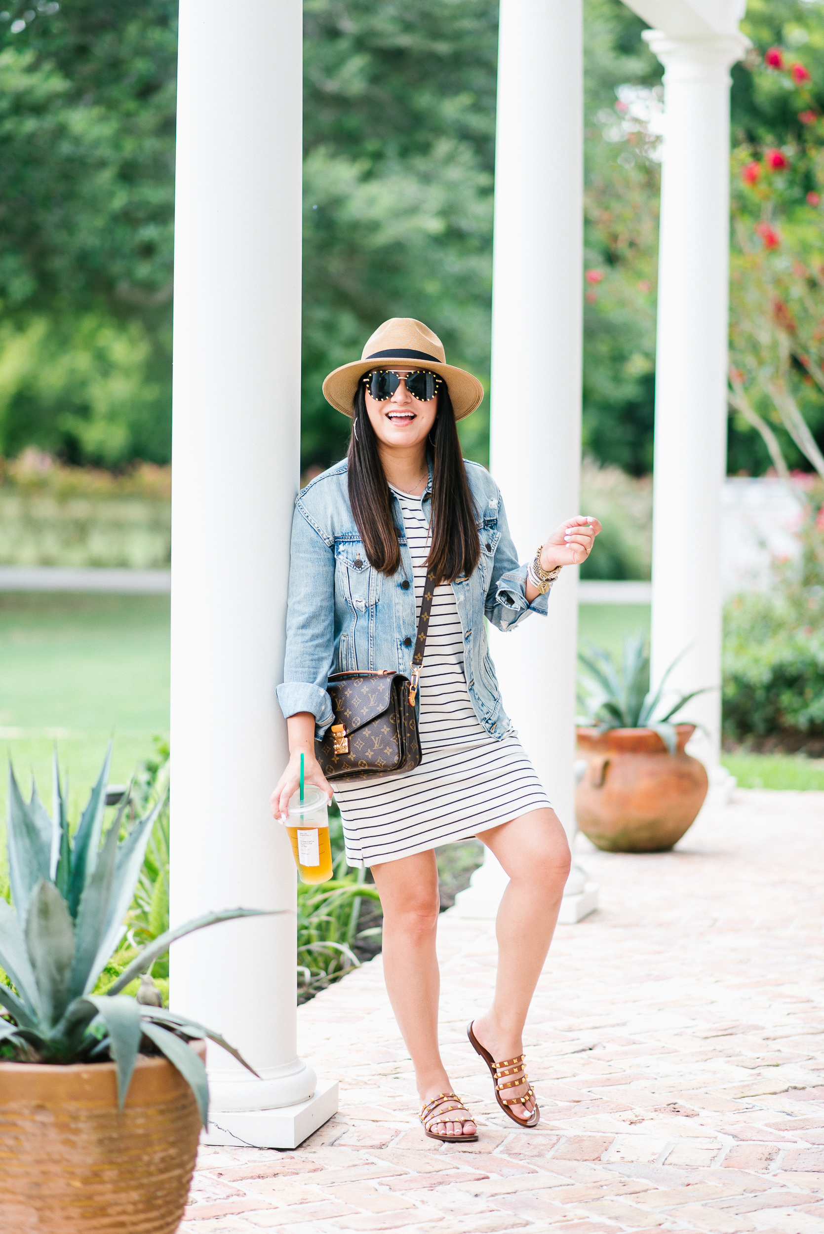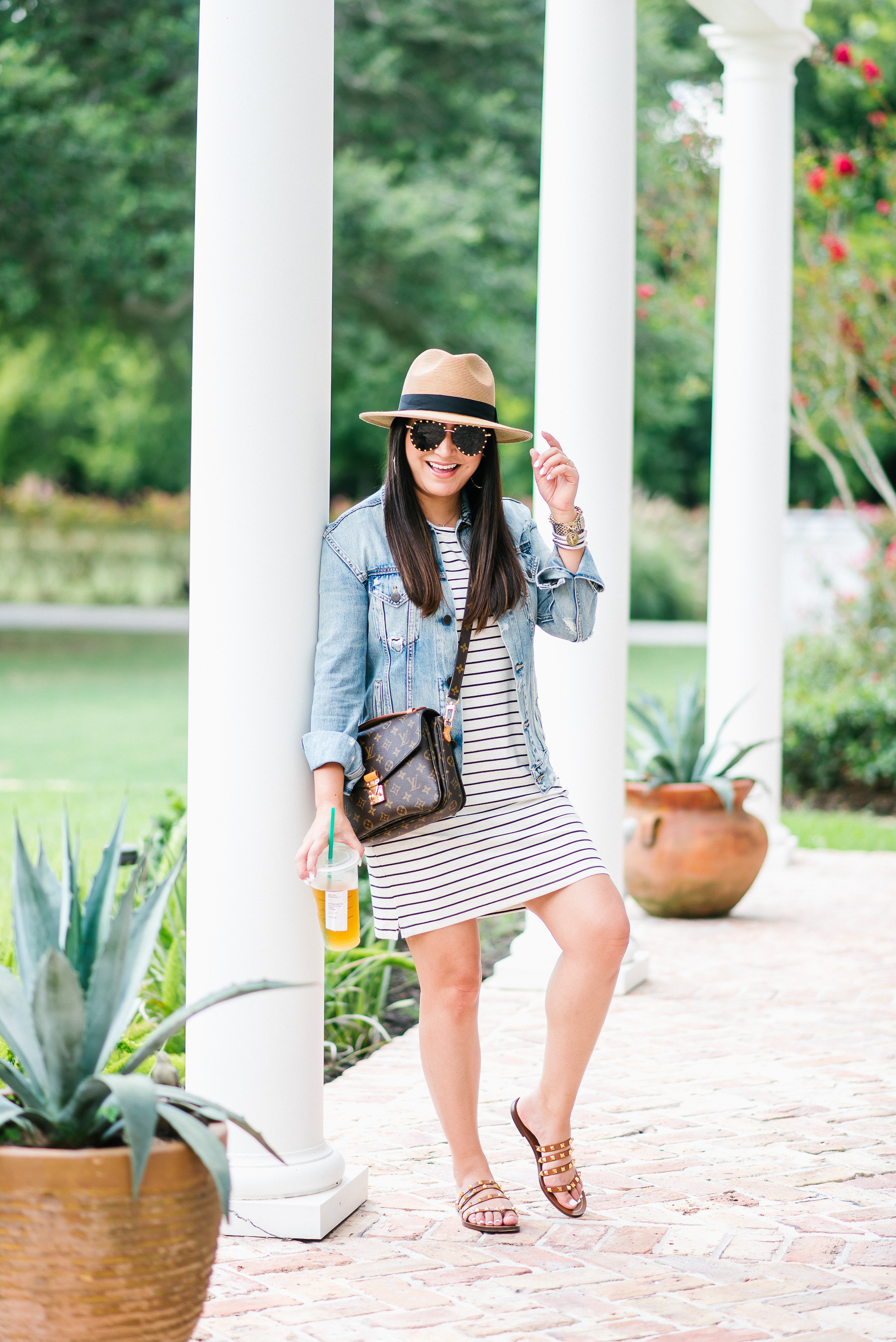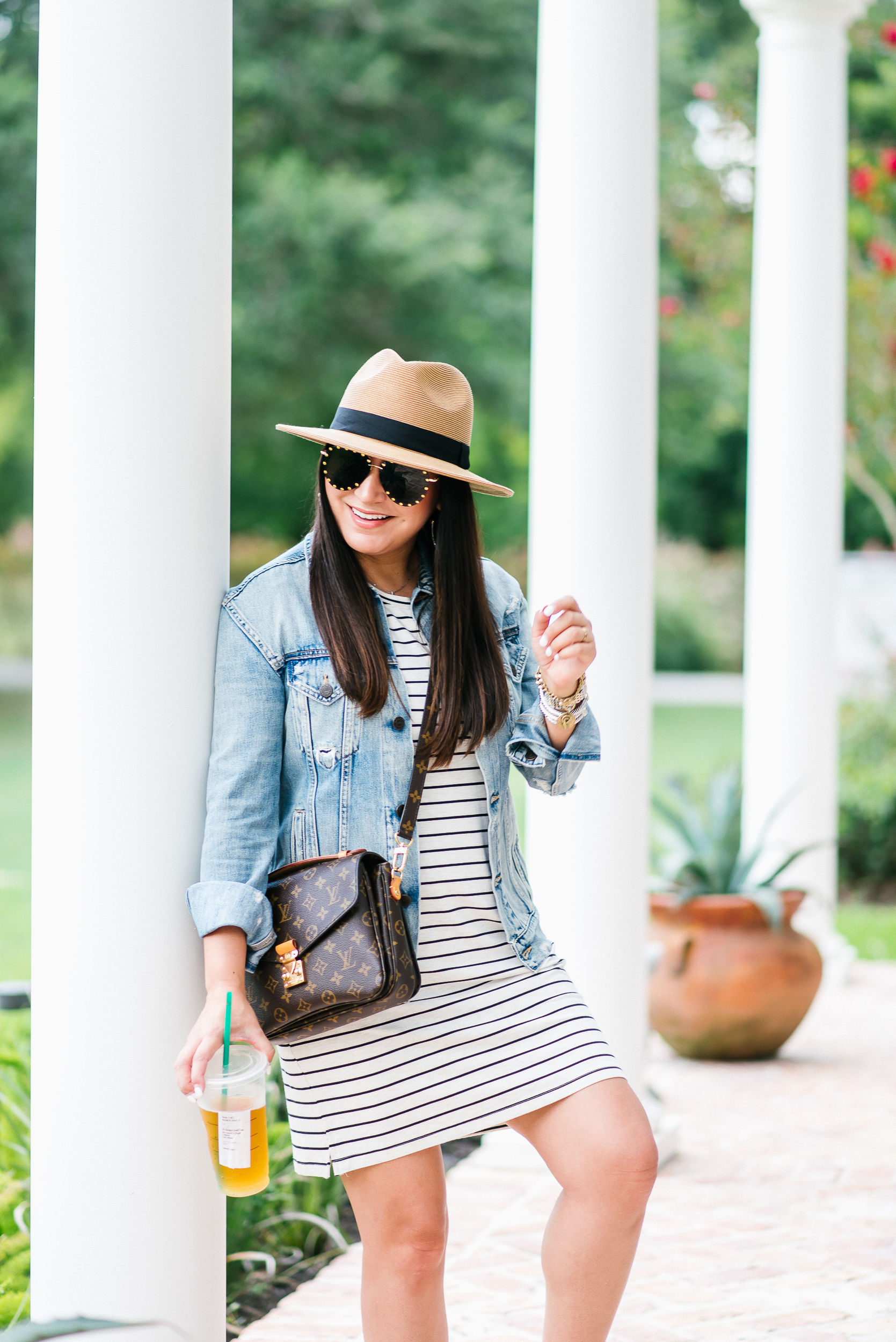 Dress – small | Denim Jacket – small | Sandals – tts | Hat | Earrings | Sunglasses | Chain bracelet | Watch | DY Bracelets | Handbag