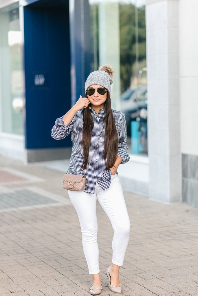 I’ve been wanting to get a gingham shirt for the longest time and when I came across this one, I knew it was perfect. Serious, this is a gingham shirt you need. I am so excited to style this shirt this season, just wait, more is coming! On another note, I picked up another beanie and I love it. The weight is perfect, it’s not too thick or chunky. Just a warning, I am kind of loving a beanie this year. So, be prepared to see this one on repeat. This look is such a fun and bright fall/winter look. Who says you can’t wear white after Labor Day?!? This whole outfit is from Nordstrom, my go-to place for fashion. They seriously have everything. If you haven’t checked out Nordstrom for your fall/winter fashion or your Christmas shopping list, you are missing out.