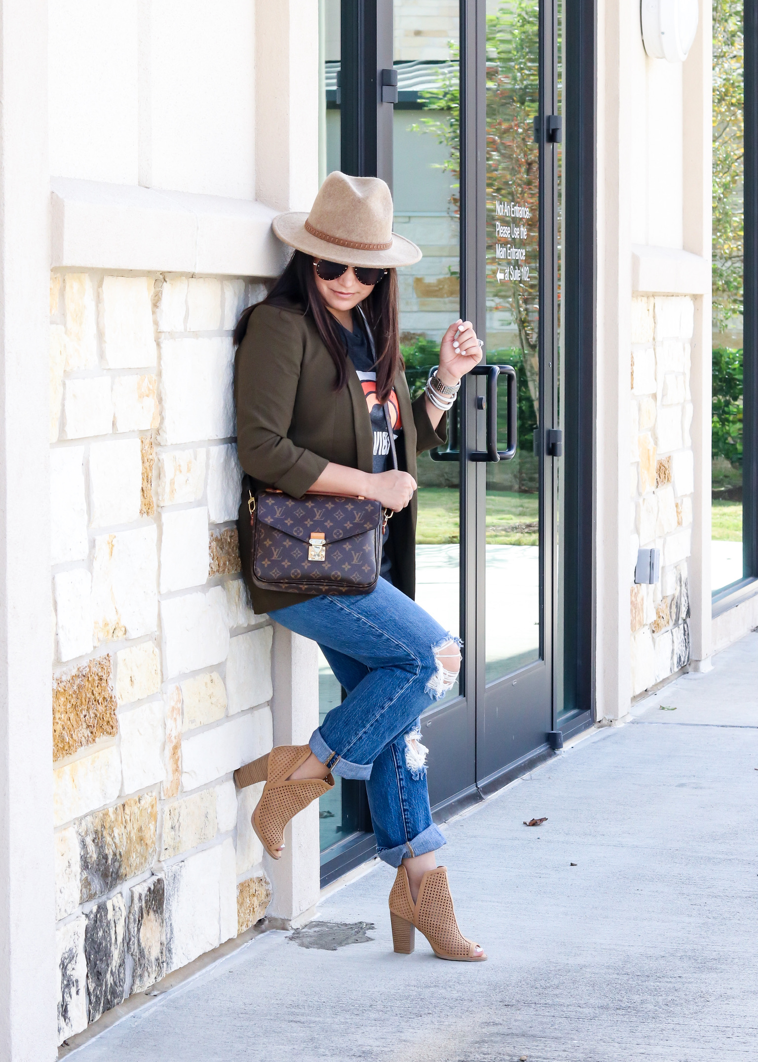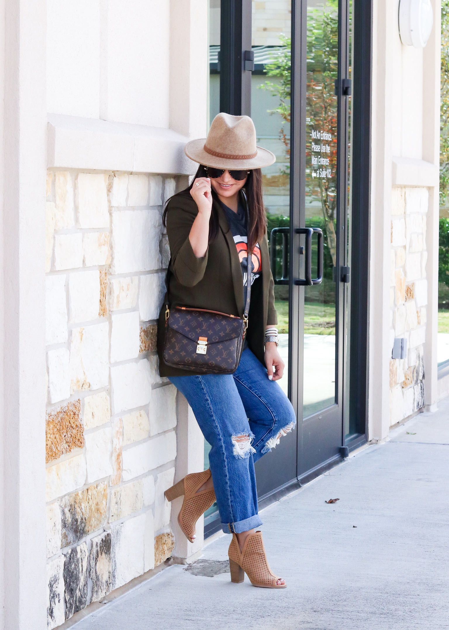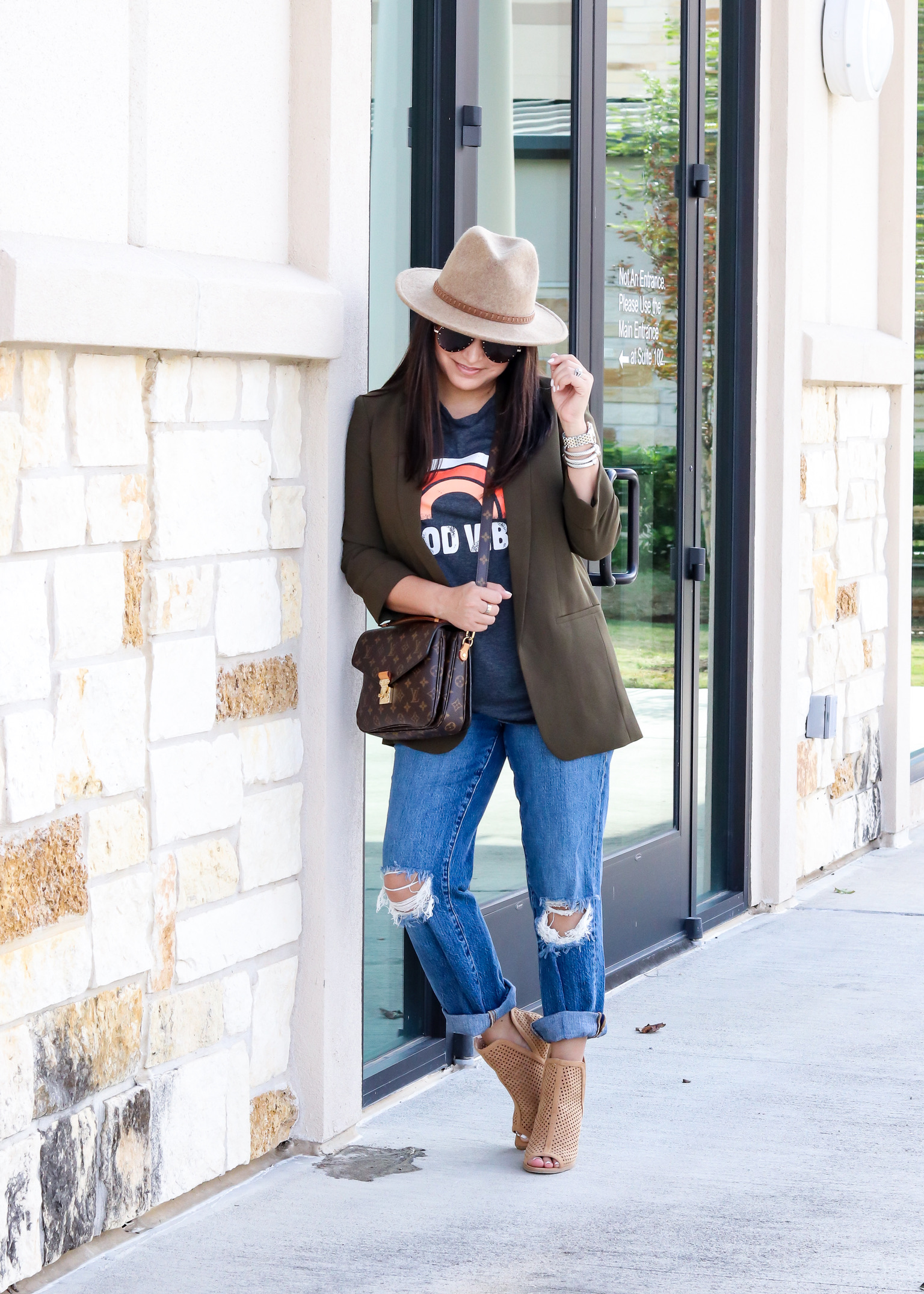 I am loving this graphic tee and blazer combo. The blazer just adds a little something to this outfit. It just works, don’t you think?! These jeans have become a go to for me. They are not something I’ve gravitated towards in the past but I am glad I gave them a try, cause I love them. There isn’t a lot of stretch because they are a mom fit, but they do run tts. This blazer has been getting a lot of wear too. The boyfriend fit makes it super versatile and it comes in pink!!