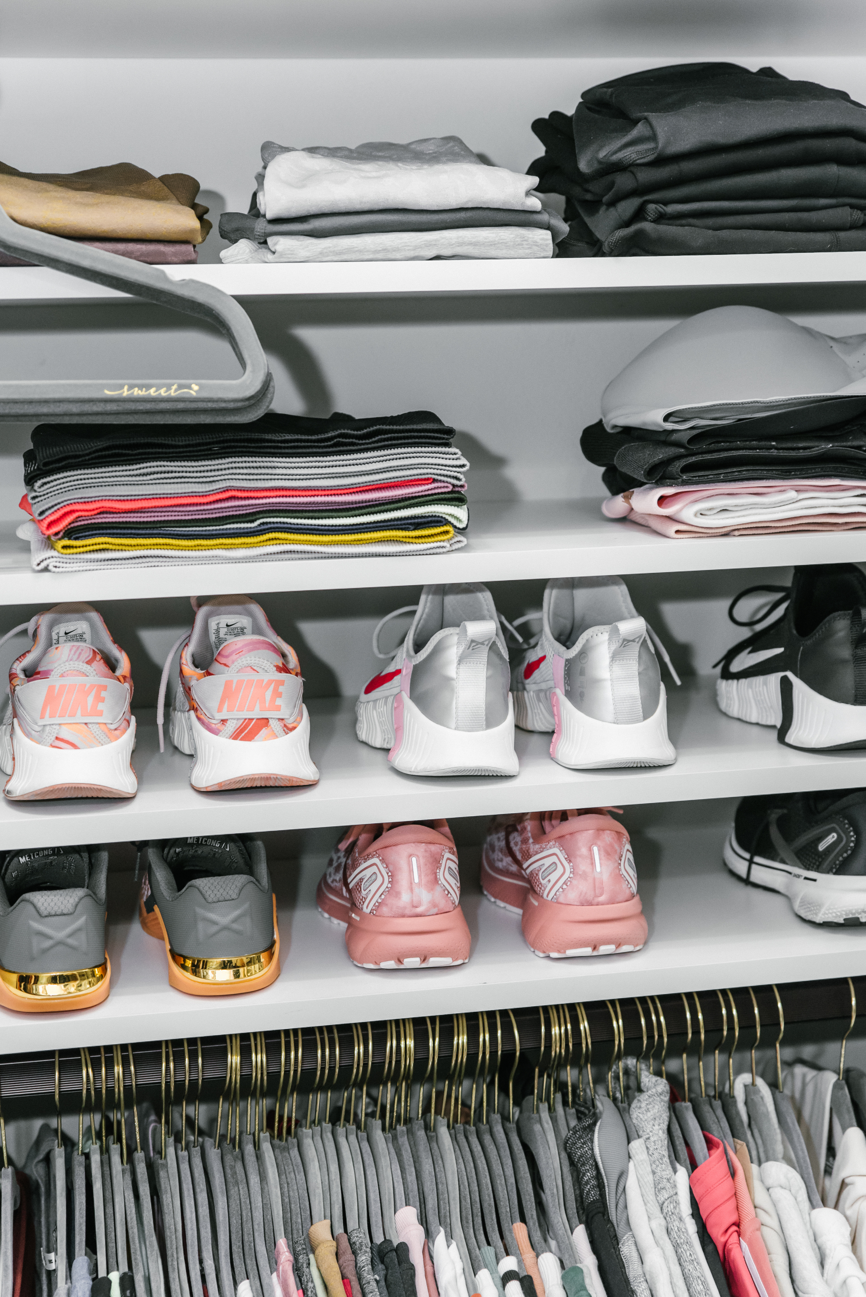 When it comes to organizing gym clothes, this is total preference. It took me a while to get to this point but I love. I tend to come from the mindset of seeing it so you use/wear it. I love having everything where I can see. I pick my workout colors based on my mood but also the workout for the day. This setup makes it easy to see what I need a grab it. My tip for organizing would be to set up a space just for your gym clothes. Put your sports bra, sneakers, etc. all together. This makes it fun to see it all together and it’s a little motivating to see it all together. I don’t know about you, but cute workout clothes motivate me to workout more!!