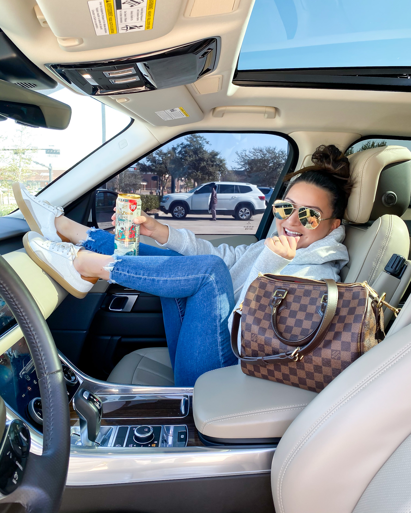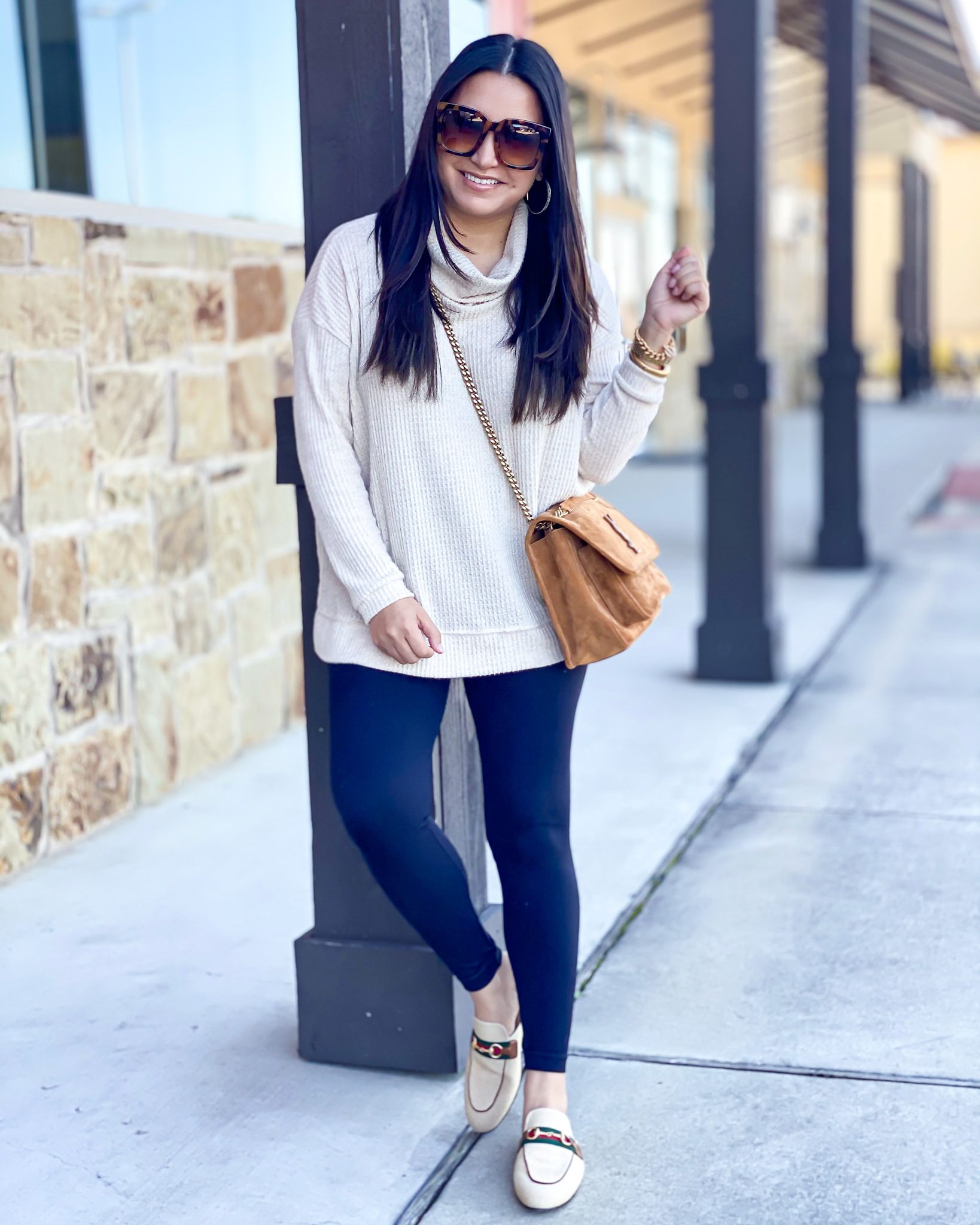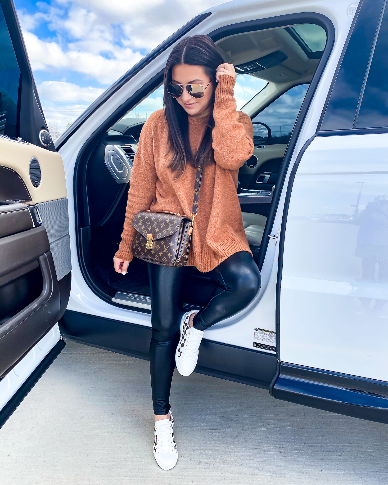 Sweater – small | Leggings – small petite | Sneakers – Louis Vuitton | Sunglasses | Watch | Bracelets | Earrrings | Handbag