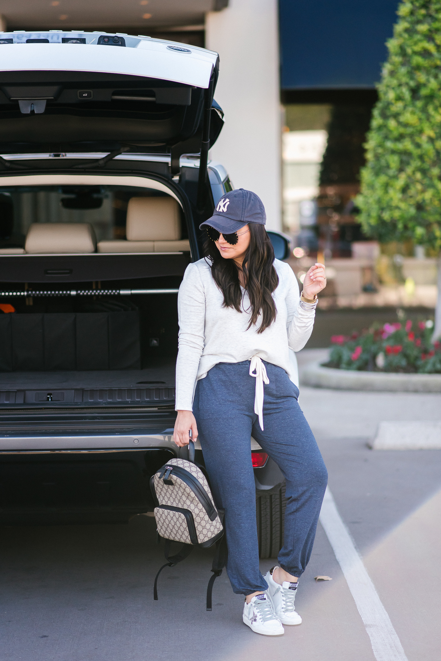 Top – small | Joggers – small | Sneakers – down half | Hat | Sunglasses | Watch | Backpack