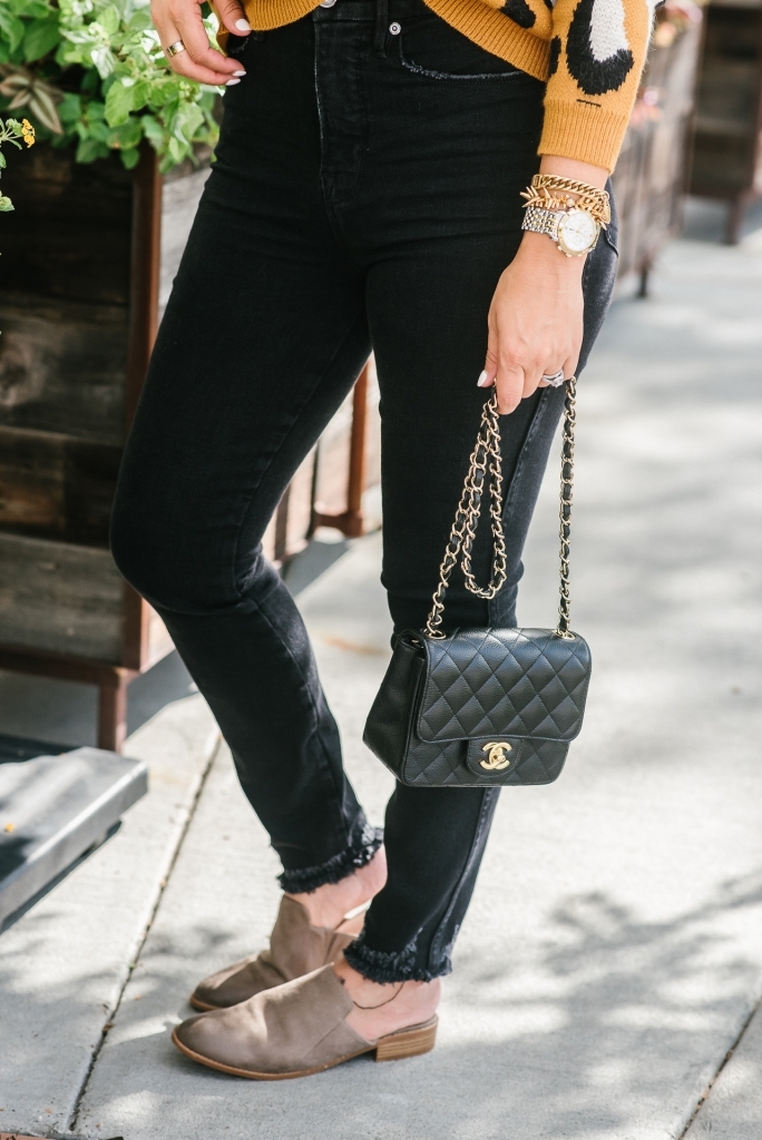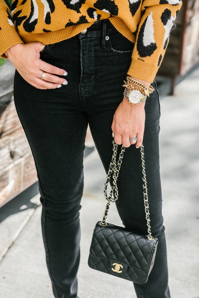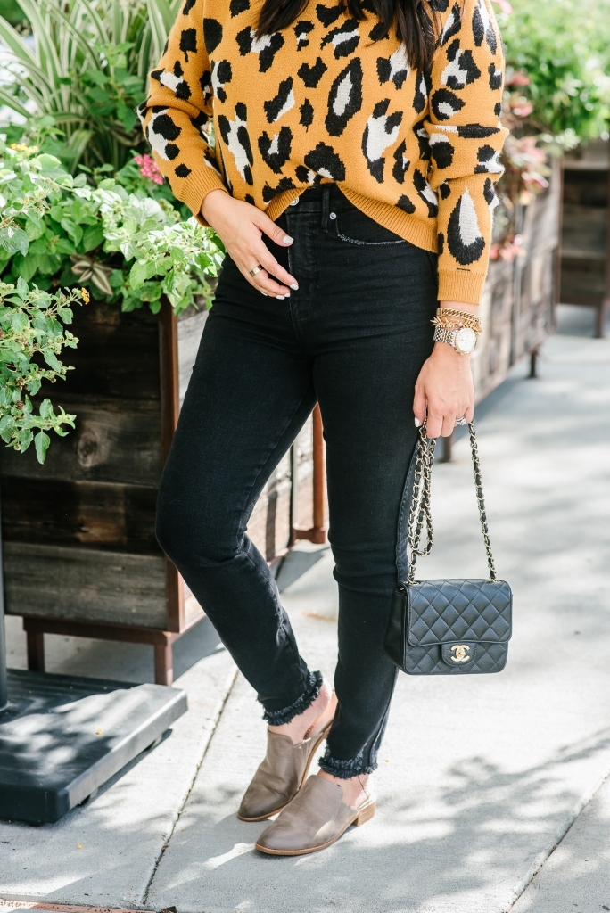 Are you tired of leopard yet? I hope not cause I have so much more to share. When I found this sweater I knew y’all would love it. Leopard on a budget but it’s still so soft. It does run a little small. I went up to a medium hoping for an oversized fit and it fits normal. It paired perfectly with these high rise jeans which are so good. I love a good distressed denim but in black these are perfect for the upcoming season. Oh, and I have to mention this lock bracelet. It’s a new fav of mine. You know I love my stacks.