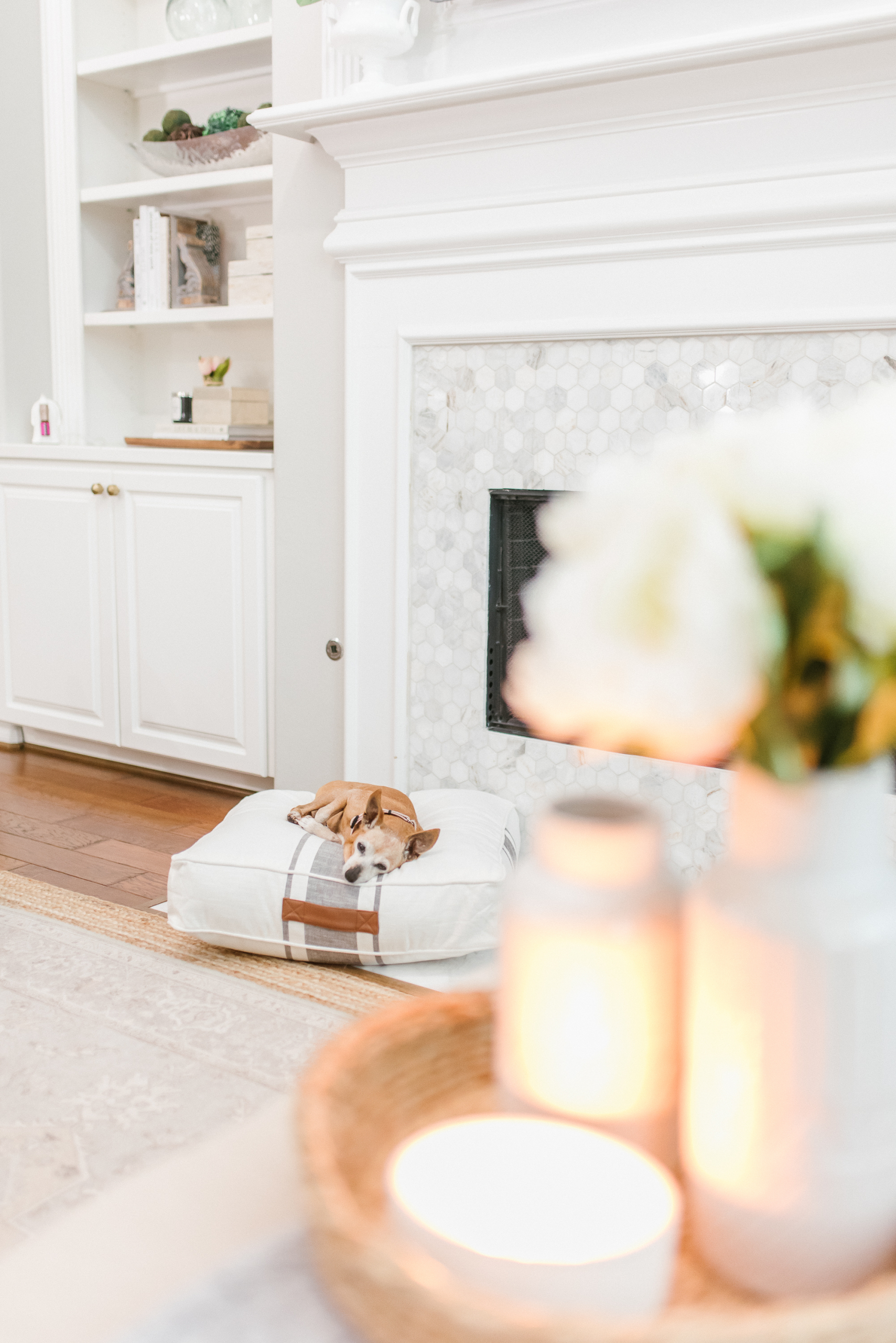 When it came time to adding the finishing touches and accessories throughout the room I knew exactly where to go. Walmart’s Spring Home collection had all the pieces to finish off this space. I found the cutest pillows, throw blankets and lots of decor for under $15! These floor lamps were one of my favorite finds and I had to snag this floor pillow aka dog bed now!!. It seriously makes the perfect pet bed, the fur-babies love it.