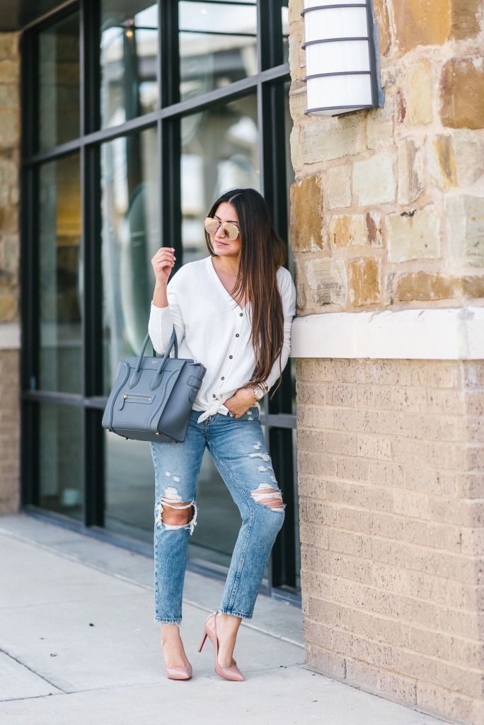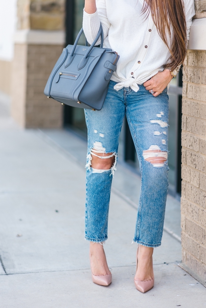I love mixing high and low when it comes in fashion and this couldn’t be a more perfect example of that. This top is $15, the jeans are on sale for just over $60 and the shoes and bag are the high in this equation. I’ve actually been wearing this shirt a ton, you’ve seen it before but I wanted to share it once more before it’s sold out. Also, if you love the jeans but want a less holey version they have them here.