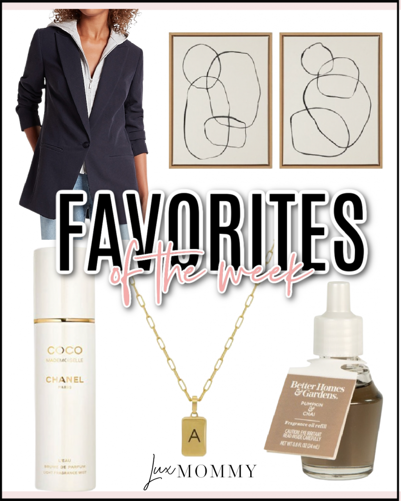 💕I am feeling this week’s favorites so much!!! This pumpkin chai scent is EVERYTHING, you need this ASAP, trust me! I have it all over the house right now!! This art work was a stand out from this week’s powder room makeover, check it out here. My all time favorite perfume now comes in a light body spray and I am just so happy, it seriously is the best smell EVER!! And I got in the cutest initial necklaces. I ordered both sizes in M’s for Mason and Matthew. They are so pretty, I love the chain. And last up was this blazer find that I’ve been wanting for a while. I had to order this one and it’s so good. I love the faux layered look. I can’t wait to style it and wear it! Shop all of this week’s favorites below👇🏼👇🏼!!
