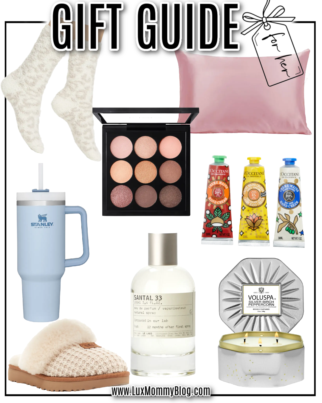Gift guide for her including cozy socks, silk pillowcase, makeup pallet, drinking tumbler, house slippers, perfume, candle, and skincare xoxoAmanda no comments Leave A Comment Share