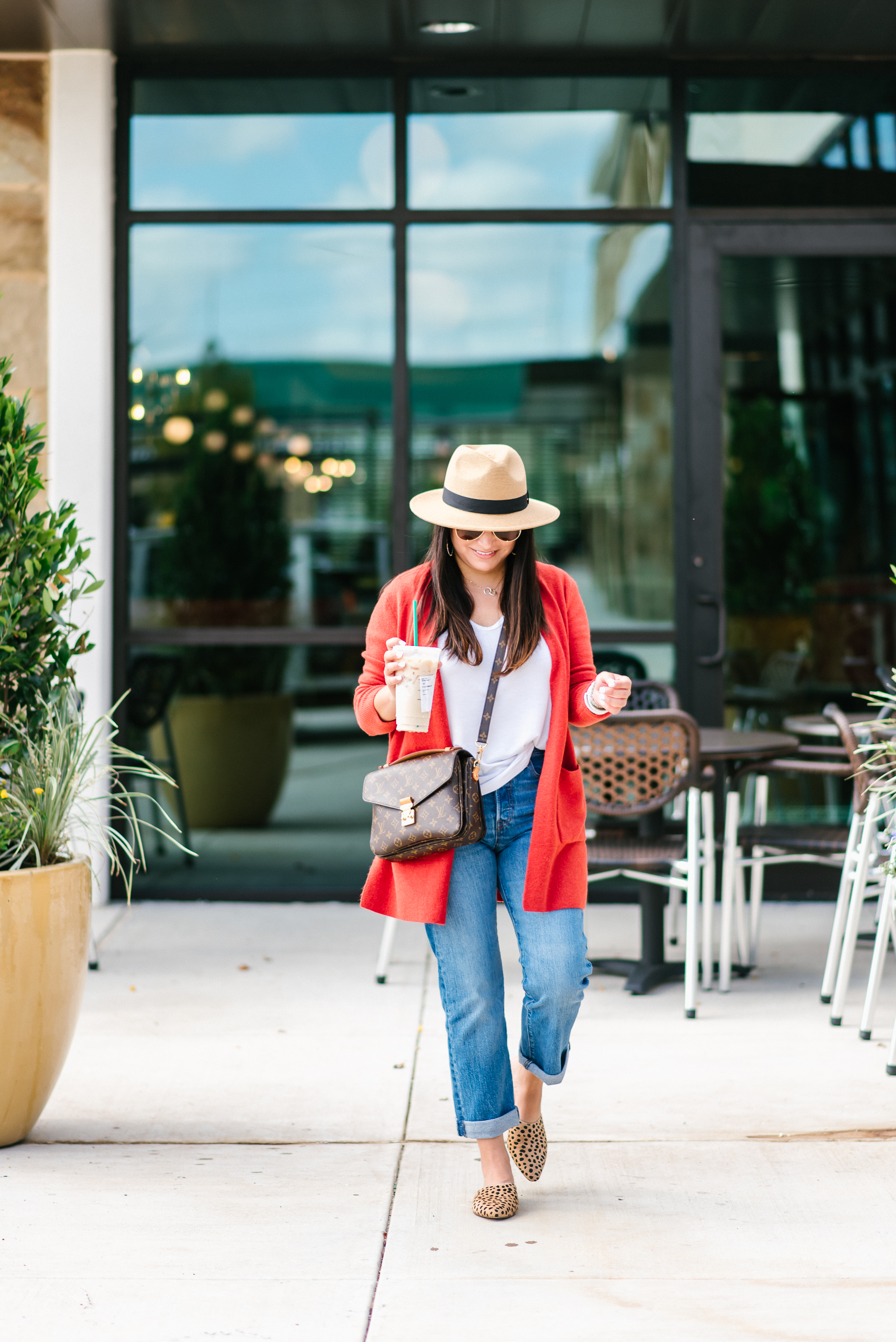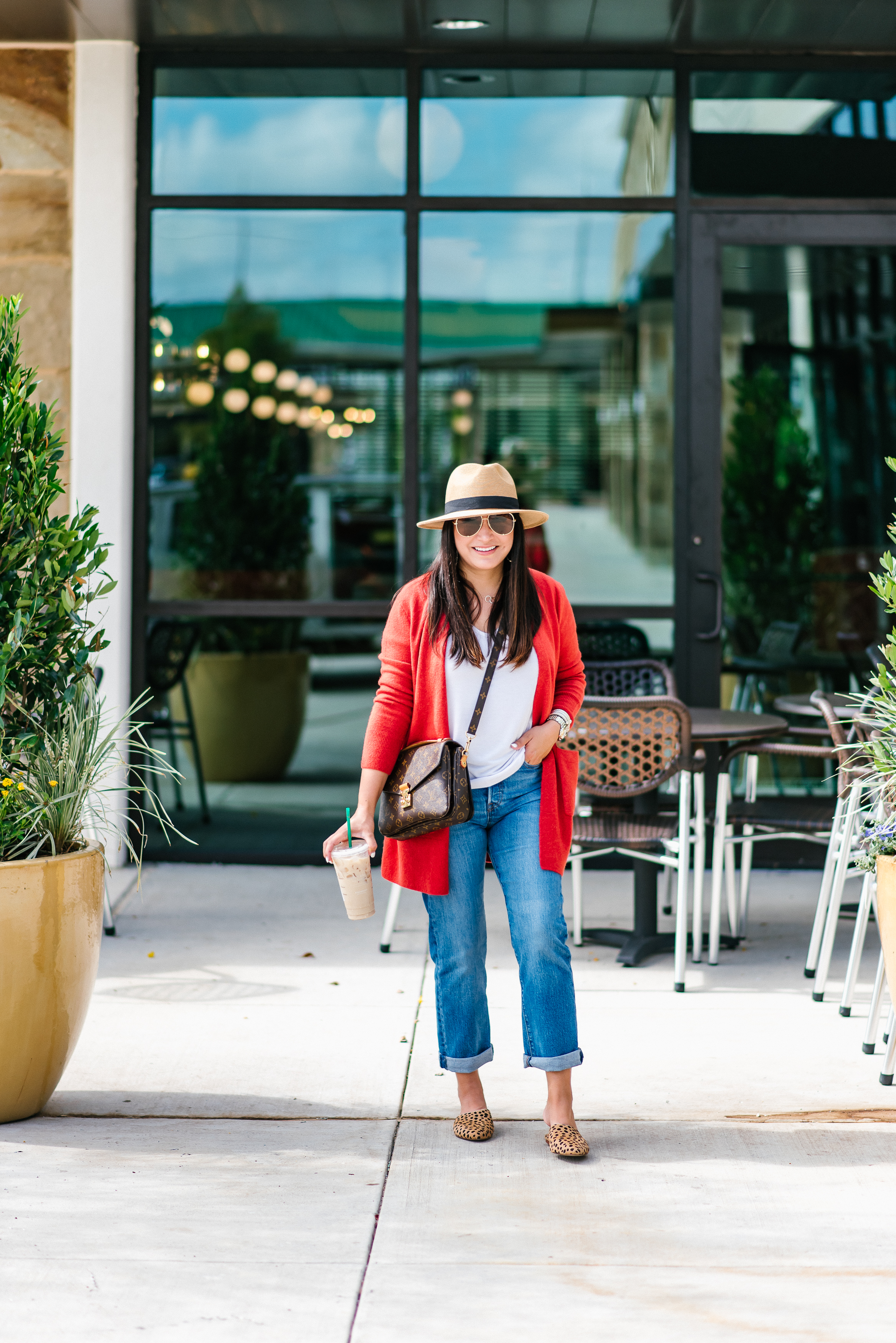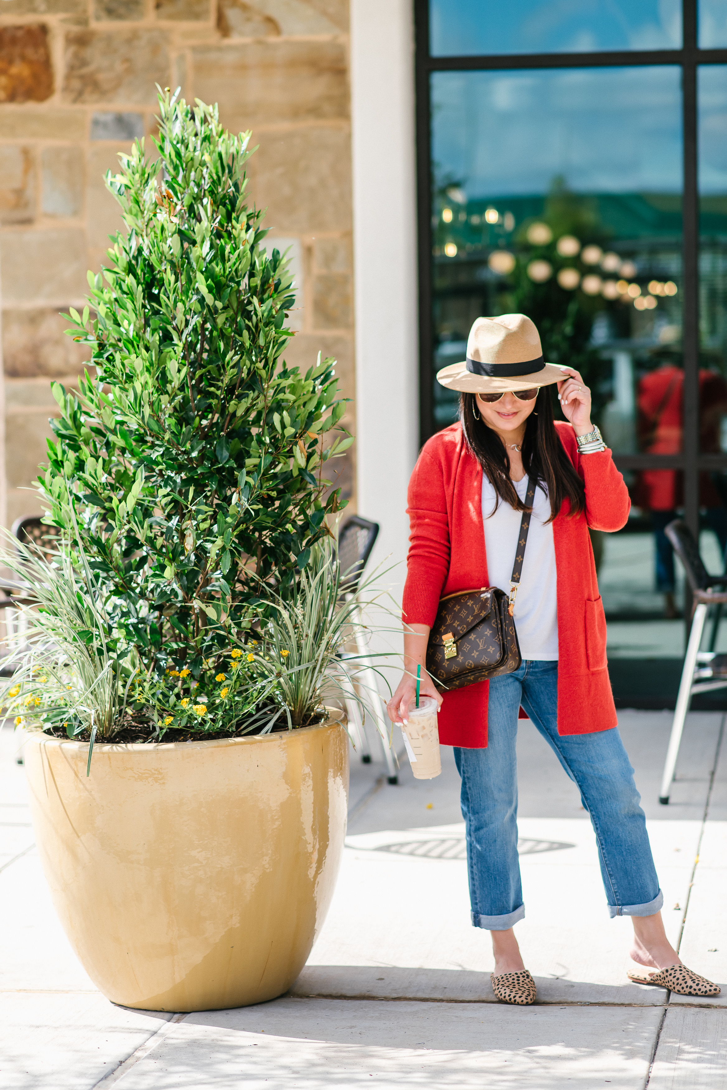 Who else is so over this heat?! I am!! I’m in fall mode and seriously have found the best fall must haves. This supersoft cardigan being one of them. It’s one of my favorite purchases for the upcoming season and it comes in a striped version here. I grabbed that one too of course. I love how simple and relaxed this outfit is. The hat just adds a little something extra don’t you think? I am just slightly obsessed with this hat, I have it in 3 colors now so, yeah I kind of like it! The quality is amazing and it’s comfortable enough to wear all day.