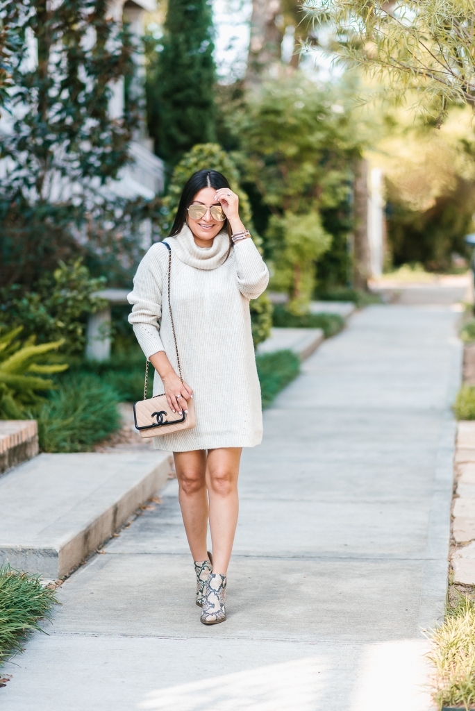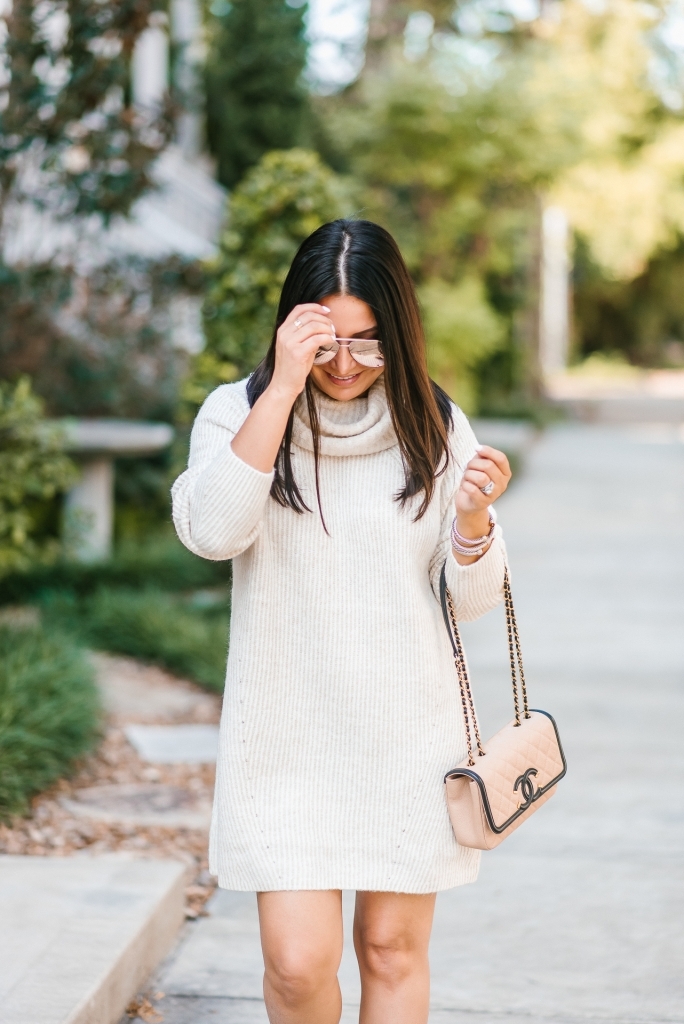Fall weather is inching in y’all and I am so excited. Every year I search high and low for a sweater dress and I am not always successful but this sweater dress is it. The sweater dress of all sweater dresses. The proportions, the turtleneck….it’s so good. It comes in 4 colors. I can totally see it with sneakers and a cross body for a more casual look. I am thinking Holiday parties too. It’s just a good one y’all. Oh and it’s not itchy at all.