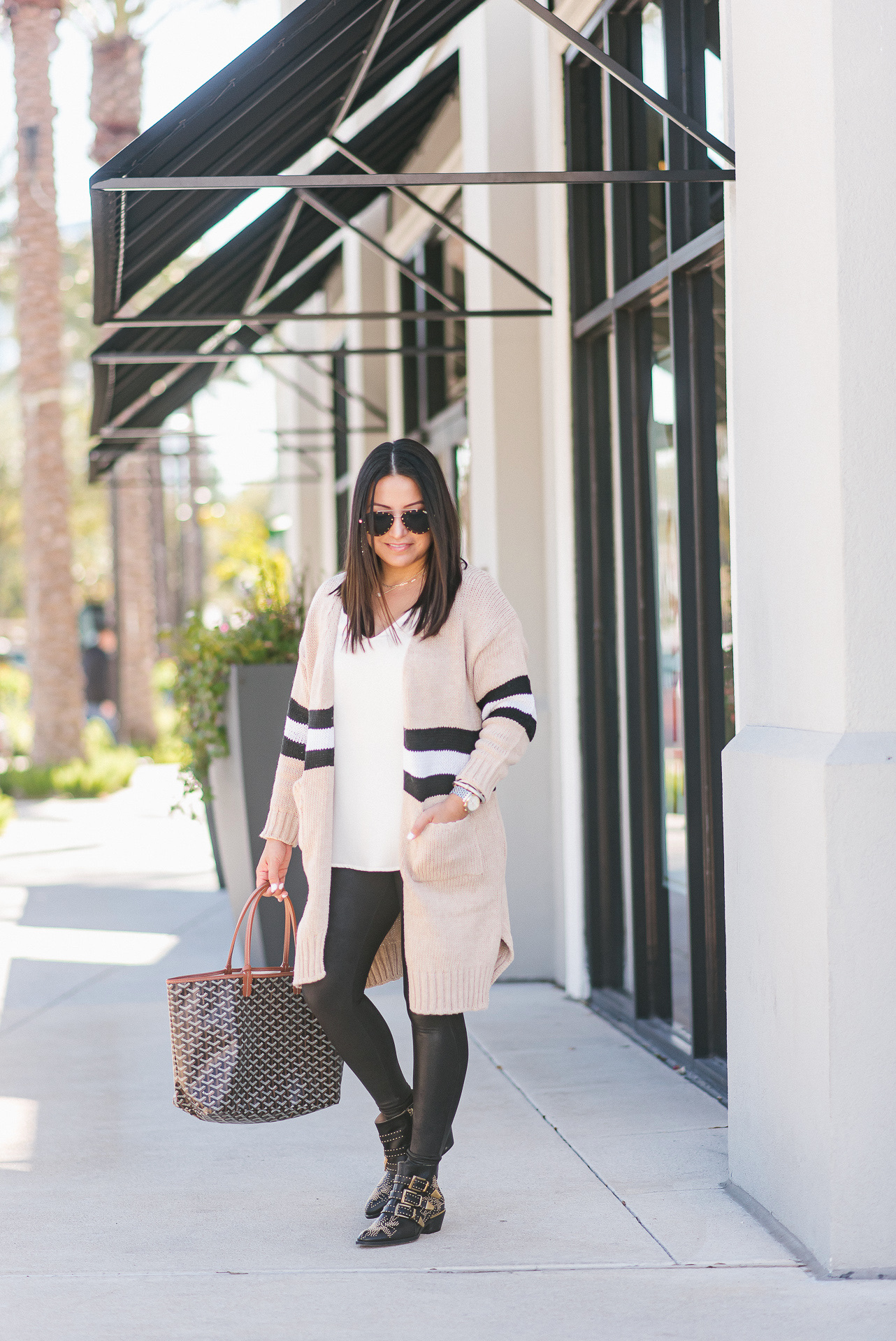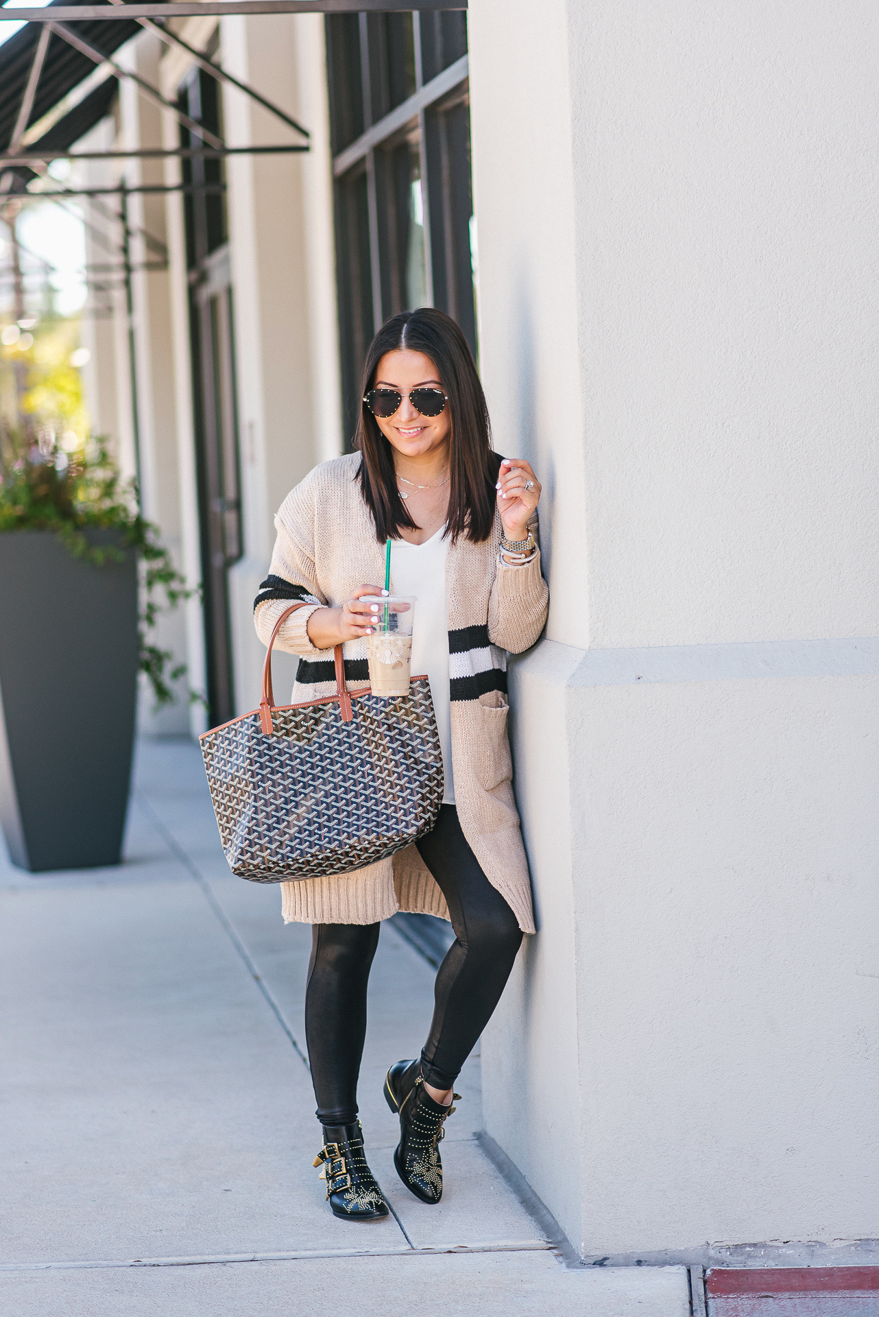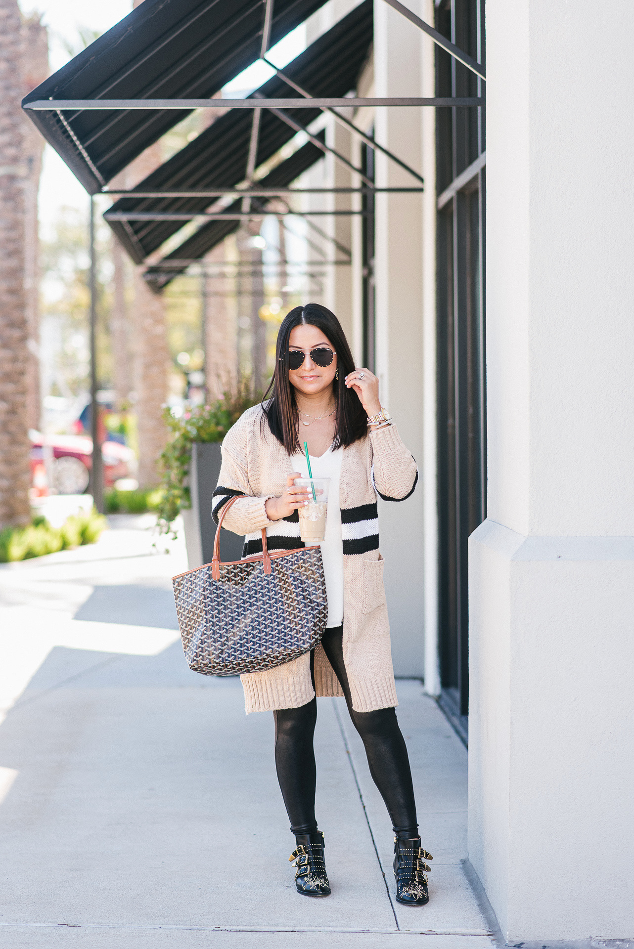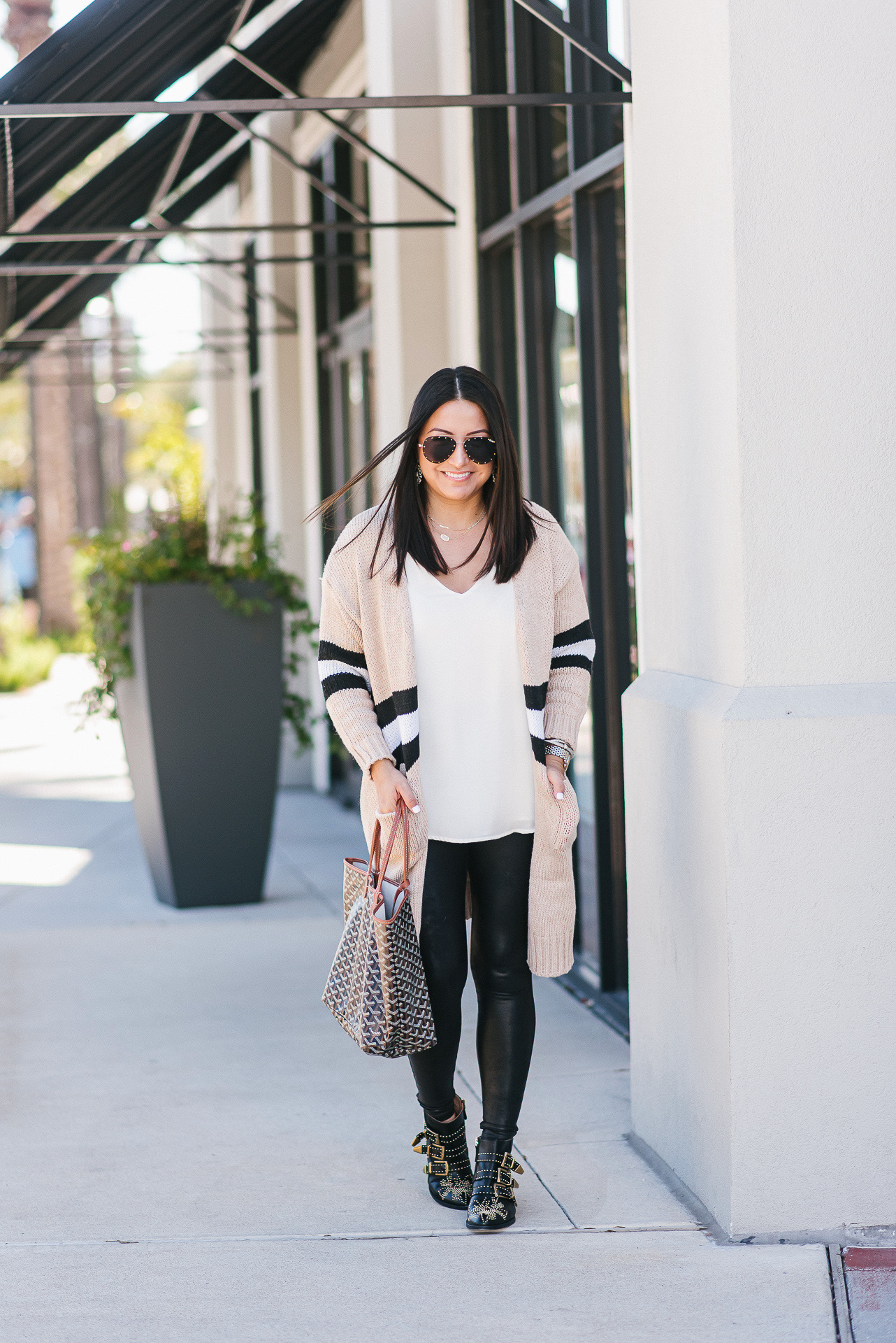 I love this striped cardigan because of the neutral colors and how it goes well with so many different things! It is one size fits all and is pretty long. I am going to share a few more stripe cardigans I like down below. I paired it with this simple white cami and my favorite faux leather leggings! Y’all know how much I love these leggings! These are just sooo good! They are flattering and comfortable, but they look dressier than regular leggings. For us shorter gals out there, they now come in petite length! I felt like this outfit needed a little pop of something so I wore these booties with gold detailing. I love the gold buckles and all the gold studs. The sunglasses I am wearing sold out but here are my new ones! Seriously, I love this outfit you guys! It is so simple but so cute.