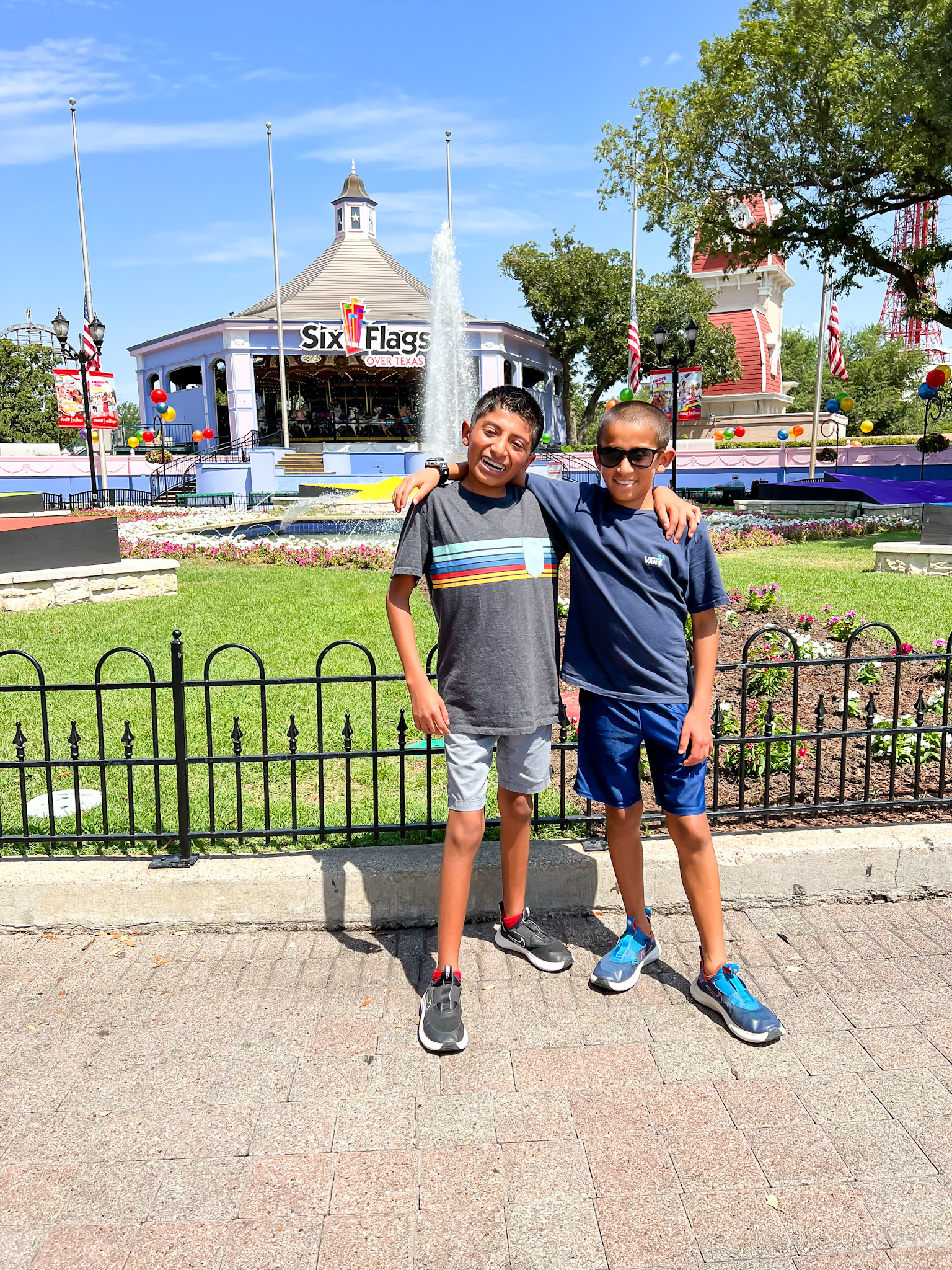 We decided to let the boys choose what we did on Saturday. It was unanimous, they wanted to go to Six flags! Six Flags is definitely high on the list for things to do in Dallas! Growing up we went to a theme park every summer but this would be our first time to Six Flags over Texas. We drove by it the day before and saw all the big roller coasters and the boys couldn’t stop talking about them.
